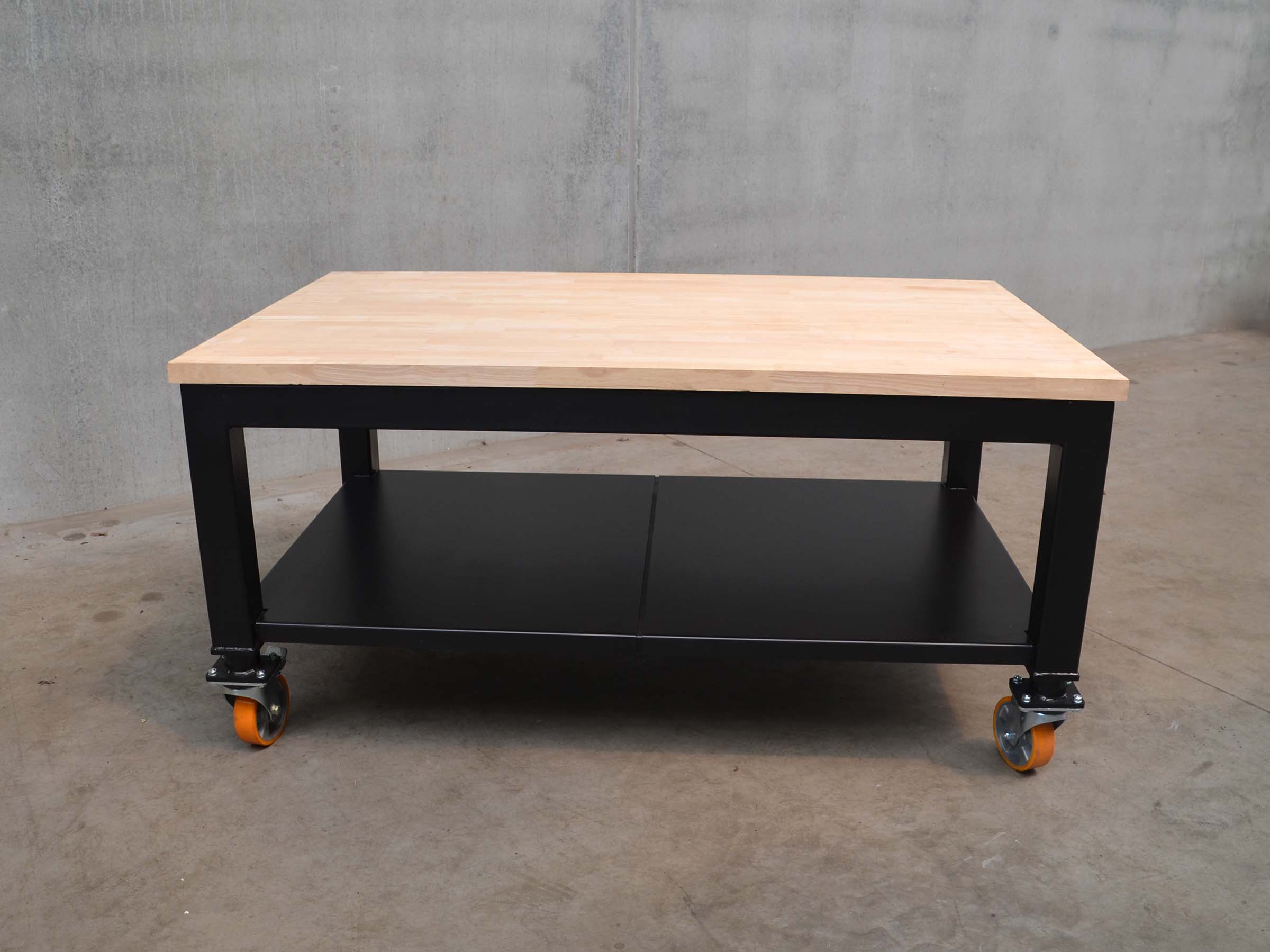 A welding table with the adjustable wheels has a minimum work height of 87cm for the top.